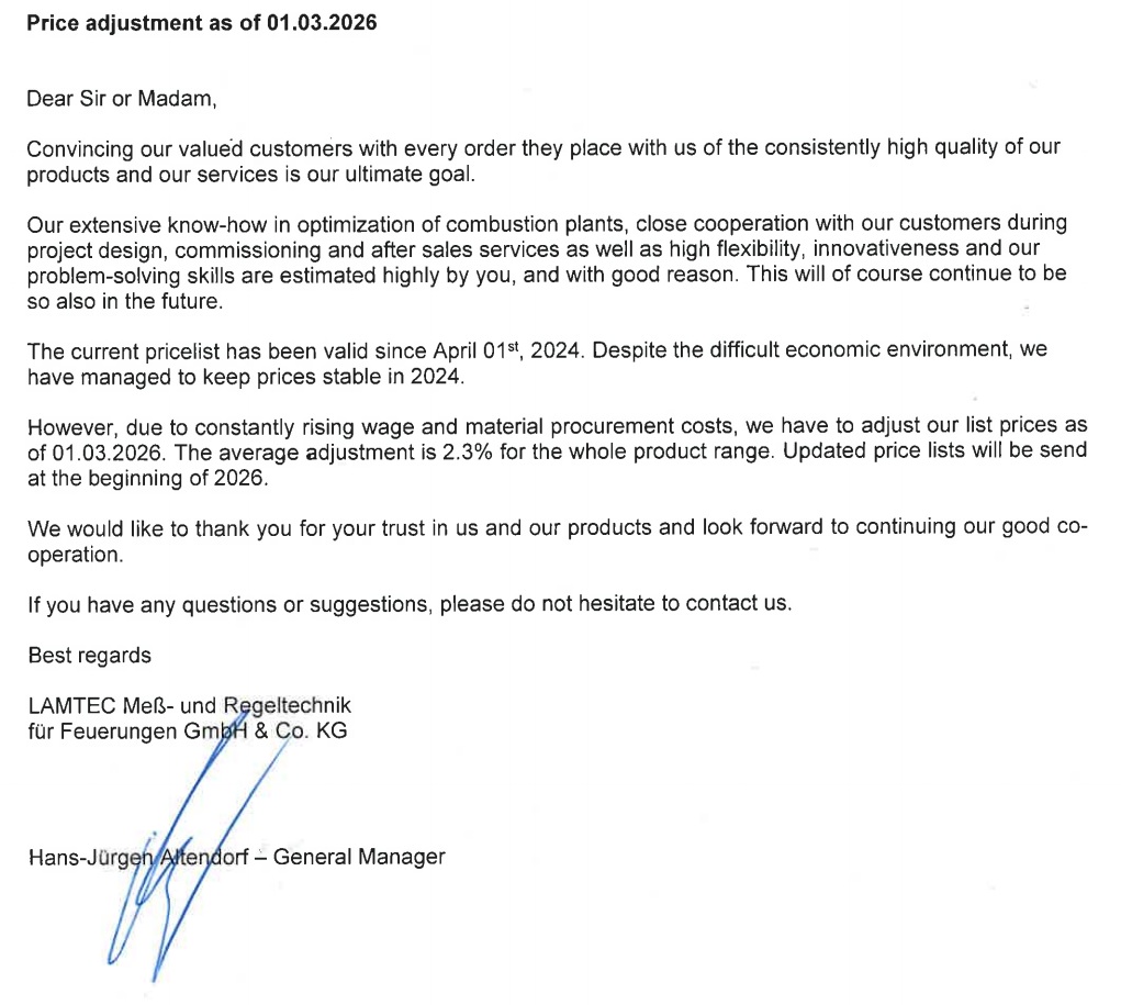 然而,由于不断的人工及物料成本的上涨,我们不得不决定自2026年3月1日起调整我们的现行价格,调整后所有产品的价格的平均涨幅大约在2.3%,更新后的价格将于2026年初发出。